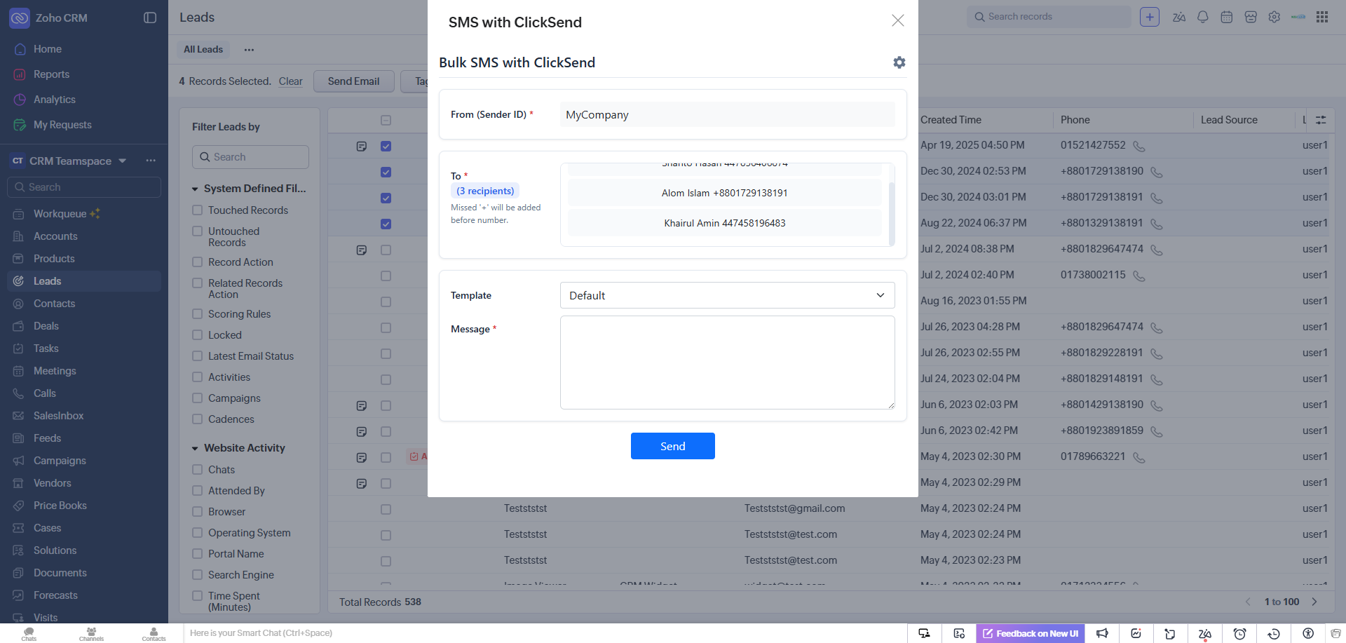 - Bulk SMS – Send to many recipients from Leads, Contacts, or Deals list/detail view.