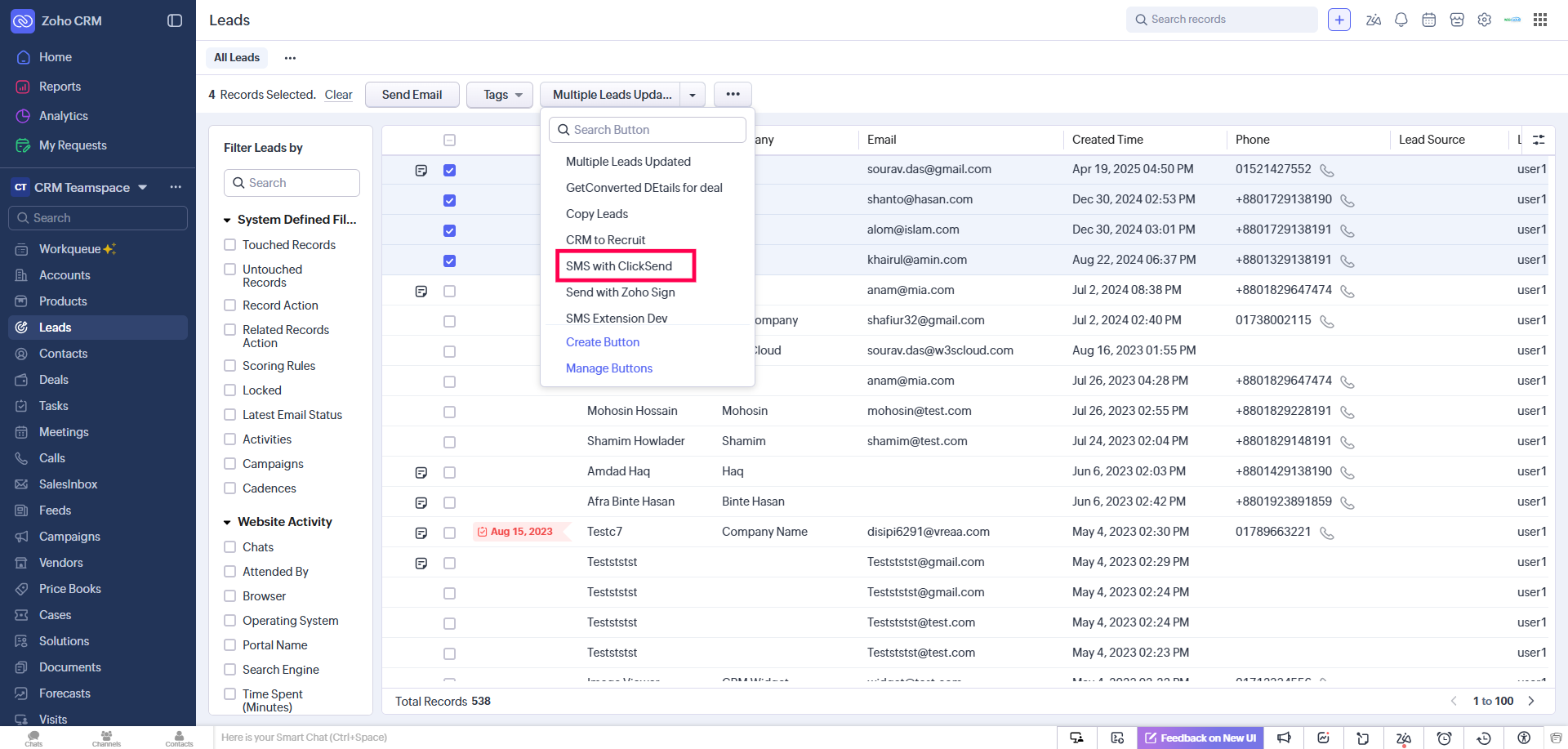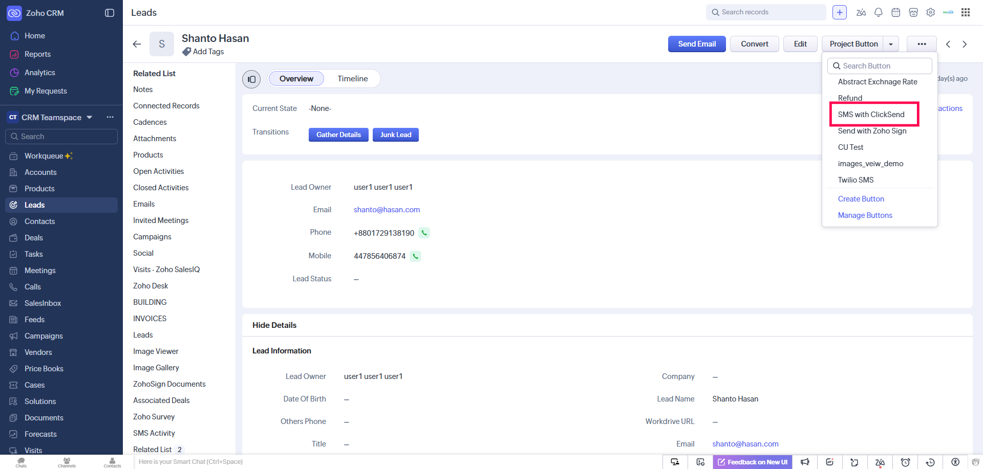 After installation, the extension is ready to use. Navigate to the modules — Leads, Contacts, Accounts, and Deals — and click the “SMS with ClickSend” button to access it.
